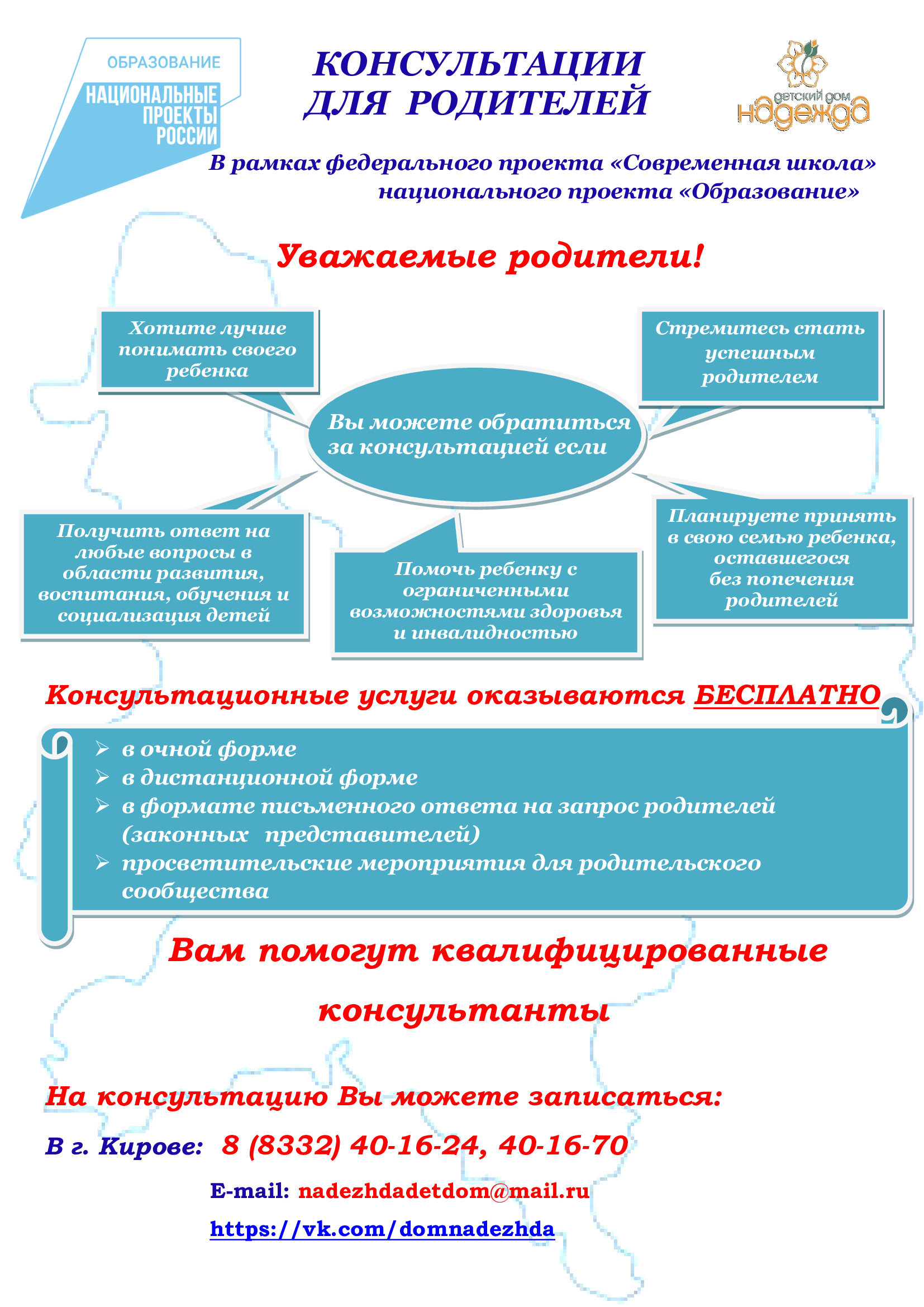 В рамках реализации федерального проекта «Современная школа» национального проекта «Образование» на базе Кировского областного государственного образовательного бюджетного учреждения для детейсирот и детей, оставшихся без попечения родителей, «Детский дом «Надежда» для детей с ограниченными возможностями здоровья г. Кирова» создана и функционирует служба оказания услуг психологопедагогической, методической и консультативной помощи родителям (законным представителям) детей, а также гражданам, желающим принять на воспитание в свою семью детей, оставшихся без попечения родителей (далее – Служба), направленная на повышение родительской компетентности в вопросах обучения, воспитания, развития детей, реализации их прав и интересов. Она включает в себя 35 базовых площадок, функционирующих на территории города Кирова и районов области, квалифицированные специалисты которых проводят консультирование родителей (законных представителей), а также граждан, желающих принять в свои семьи детей, оставшихся без попечения родителей.